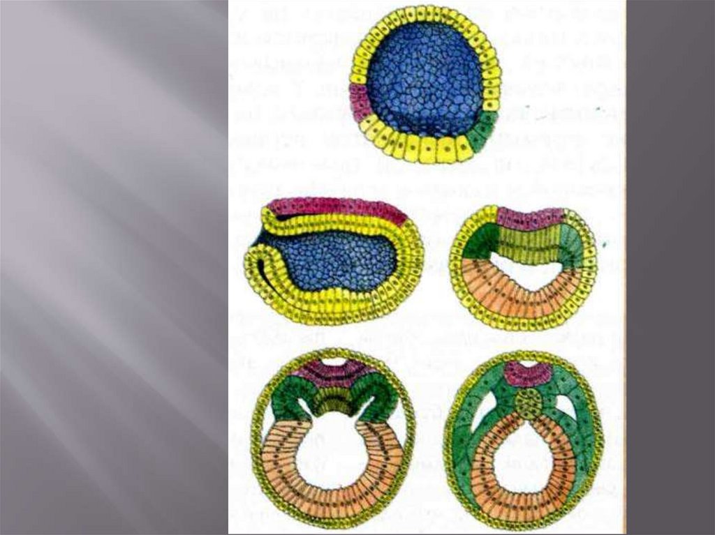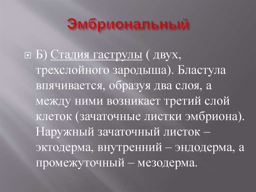 Б) Стадия гаструлы ( двух,трехслойного зародыша). Бластула