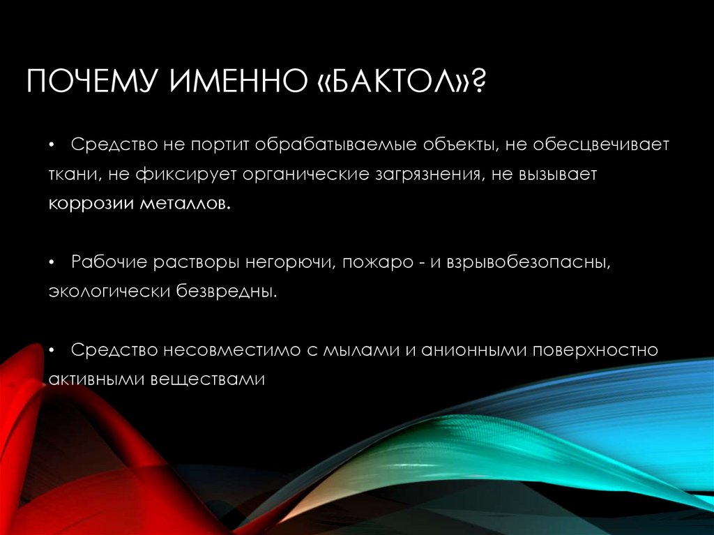 ПОЧЕМУ ИМЕННО «БАКТОЛ»?• Средство не портит обрабатываемые объекты, не обесцвечивает