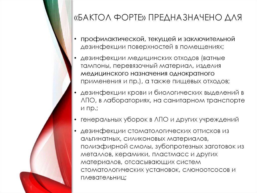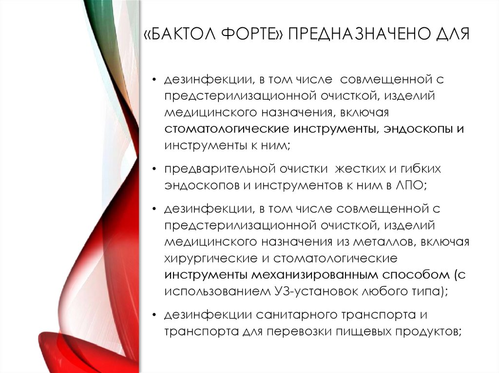«БАКТОЛ ФОРТЕ» ПРЕДНАЗНАЧЕНО ДЛЯ• дезинфекции, в том числе совмещенной с