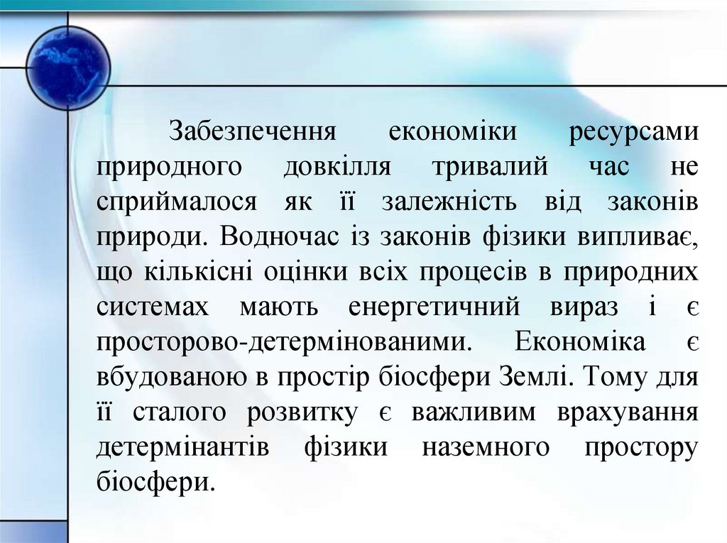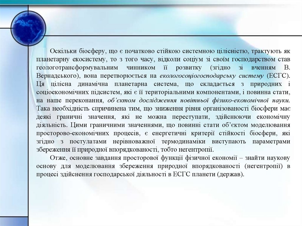просторово-економічних процесів, є енергетичні критерії стійкості біосфери, які