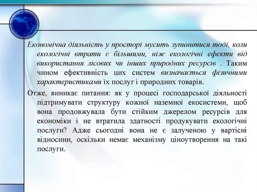 Економічна діяльність у просторі мусить зупинитися тоді, колиекологічні втрати є більшими, ніж екологічні ефекти від