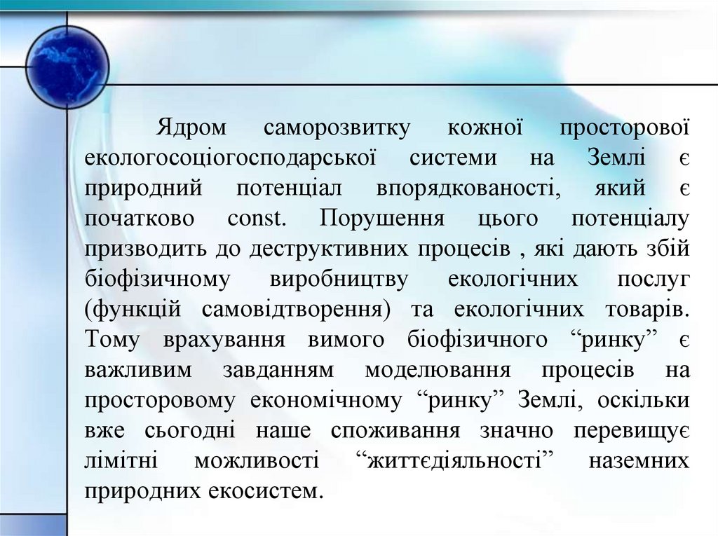 Ядром саморозвитку кожної просторовоїекологосоціогосподарської системи на Землі є