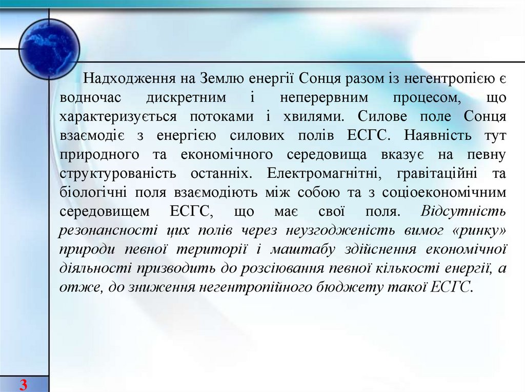 Отже, негентропійний «бюджет» кожної ЕСГС є визначальноюкомпонентою енергетичного бюджету Землі (за С. Подолинським), тому