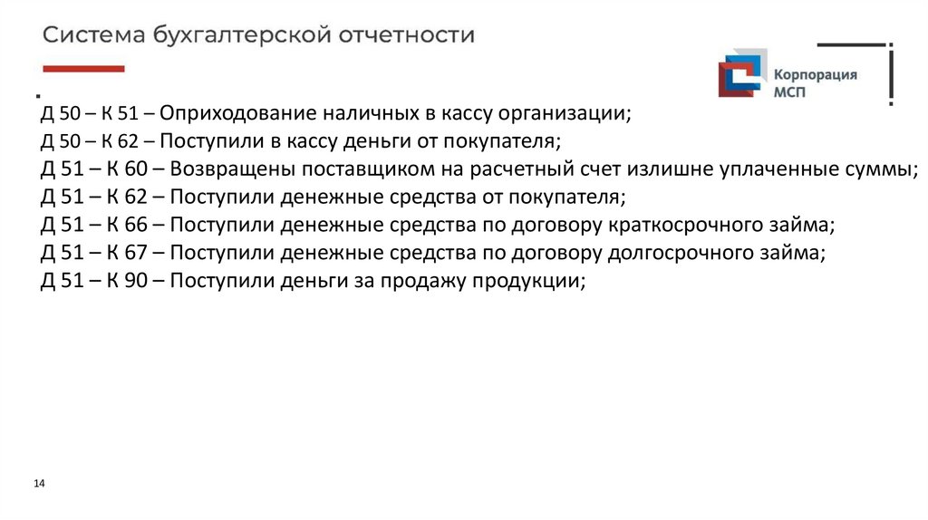 Д 50 – К 51 – Оприходование наличных в кассу организации;Д 50 – К 62 – Поступили в кассу деньги от покупателя;