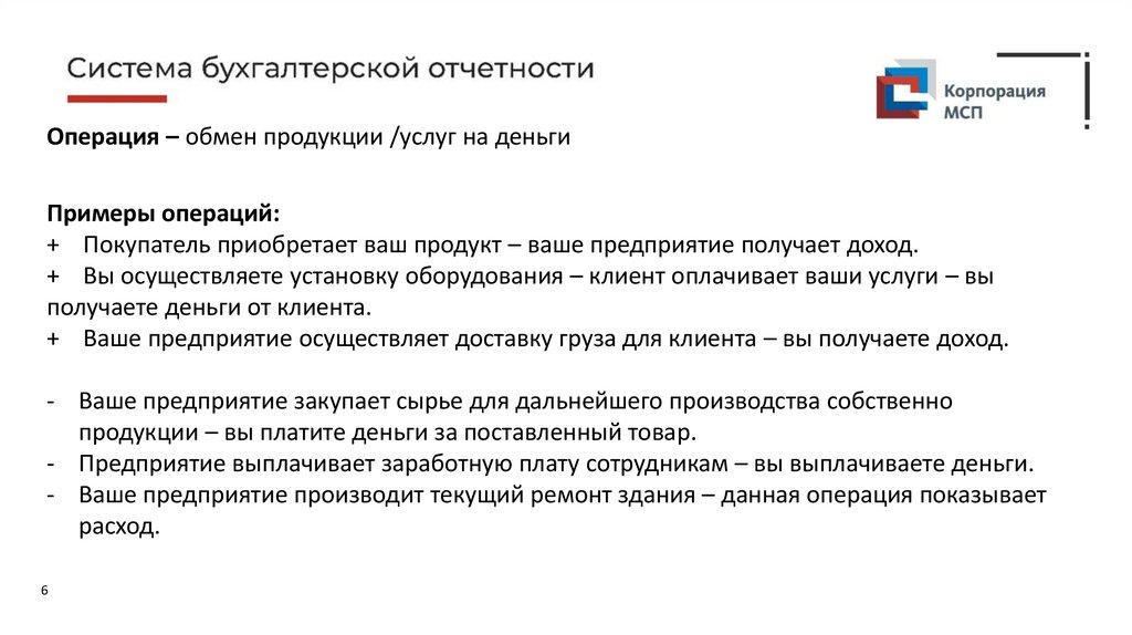 Операция – обмен продукции /услуг на деньгиПримеры операций: