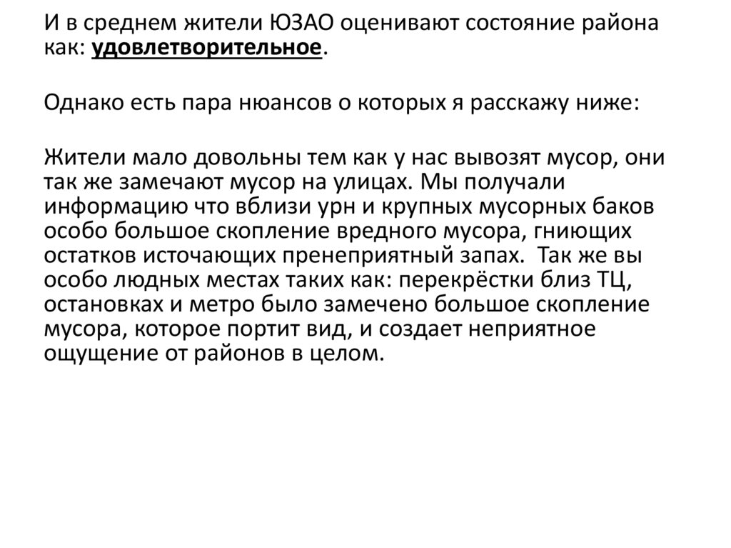 И в среднем жители ЮЗАО оценивают состояние районакак: удовлетворительное.