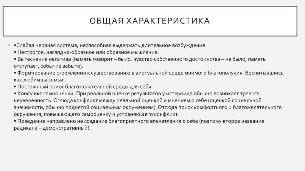 ОБЩАЯ ХАРАКТЕРИСТИКА• •Слабая нервная система, неспособная выдержать длительное возбуждение.