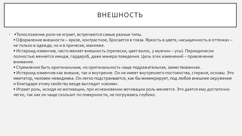 • Истероид изменчив как внешне, так и внутренне. Он не имеет внутреннего постоянства, стержня, основы. Это