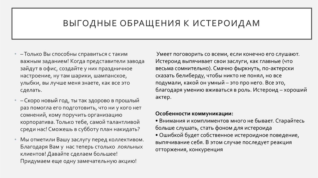 ВЫГОДНЫЕ ОБРАЩЕНИЯ К ИСТЕРОИДАМ• – Только Вы способны справиться с таким