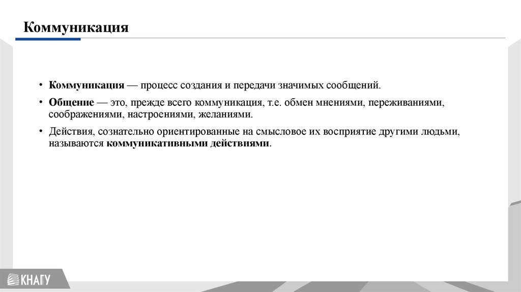 Коммуникация• Коммуникация — процесс создания и передачи значимых сообщений.