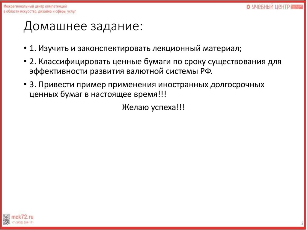 Домашнее задание:• 1. Изучить и законспектировать лекционный материал;