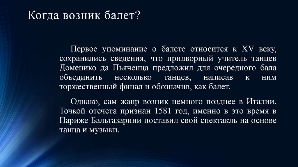 Когда возник балет?Первое упоминание о балете относится к XV веку,