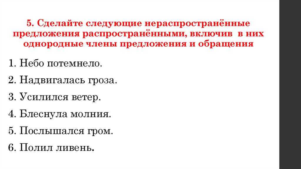 5. Сделайте следующие нераспространённыепредложения распространёнными, включив в них