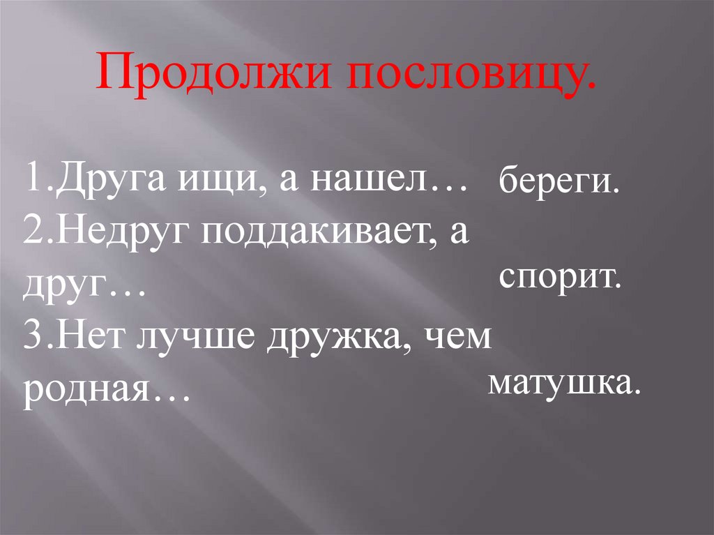 Продолжи пословицу.1.Друга ищи, а нашел… береги.