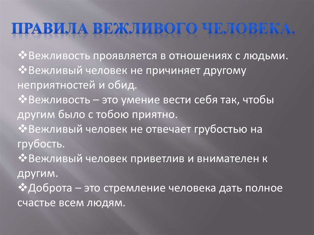 Вежливость проявляется в отношениях с людьми.Вежливый человек не причиняет другому