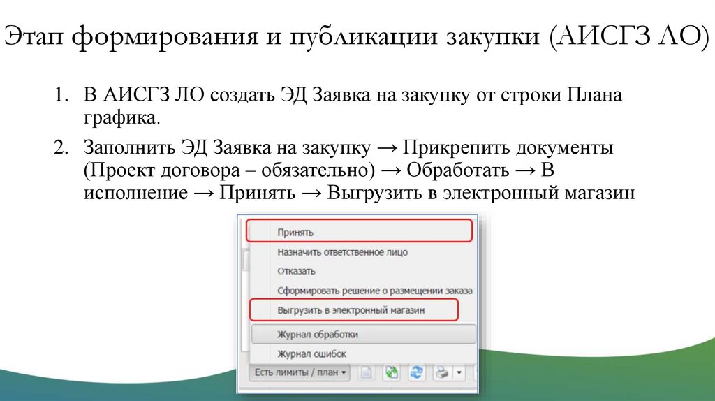 Этап формирования и публикации закупки (АИСГЗ ЛО)1. В АИСГЗ ЛО создать ЭД Заявка на закупку от строки Плана