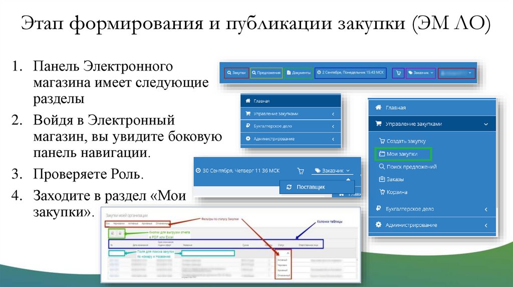 Этап формирования и публикации закупки (ЭМ ЛО)1. Панель Электронного