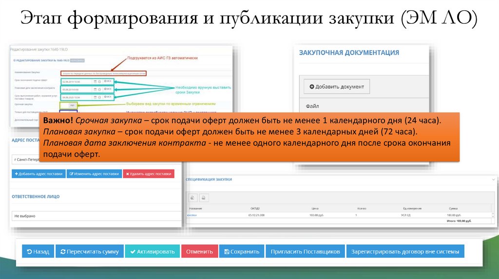Этап формирования и публикации закупки (ЭМ ЛО)Важно! Срочная закупка – срок подачи оферт должен быть не менее 1 календарного дня (24 часа).