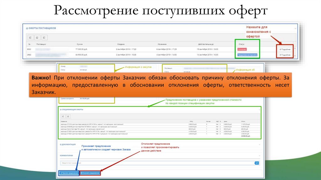 Рассмотрение поступивших офертВажно! При отклонении оферты Заказчик обязан обосновать причину отклонения оферты. За