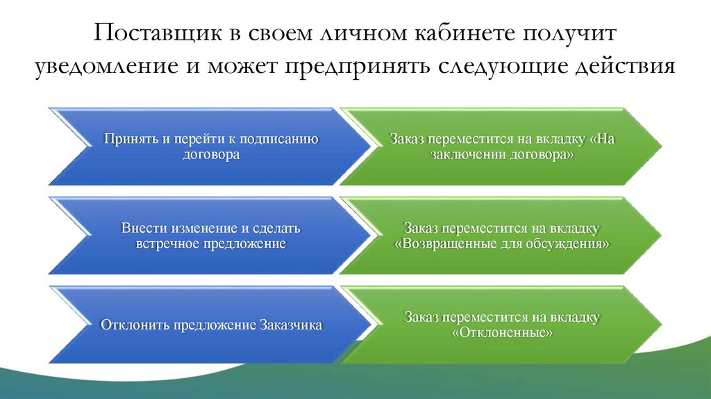 Поставщик в своем личном кабинете получитуведомление и может предпринять следующие действия