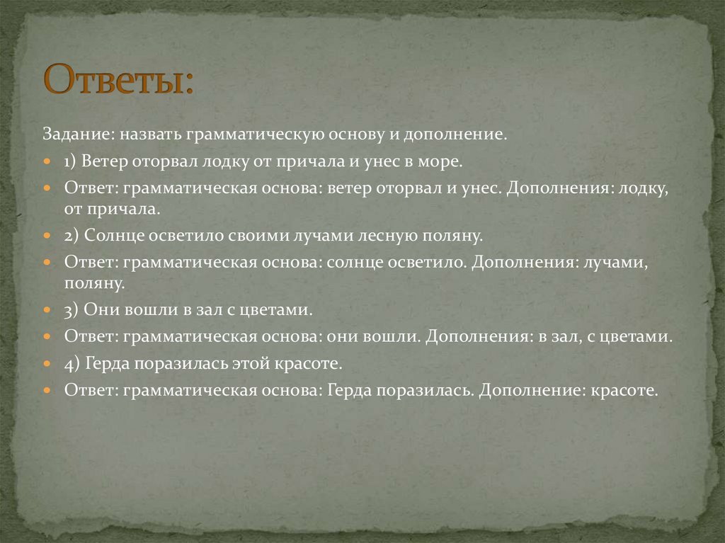 Задание: назвать грамматическую основу и дополнение.1) Ветер оторвал лодку от причала и унес в море.