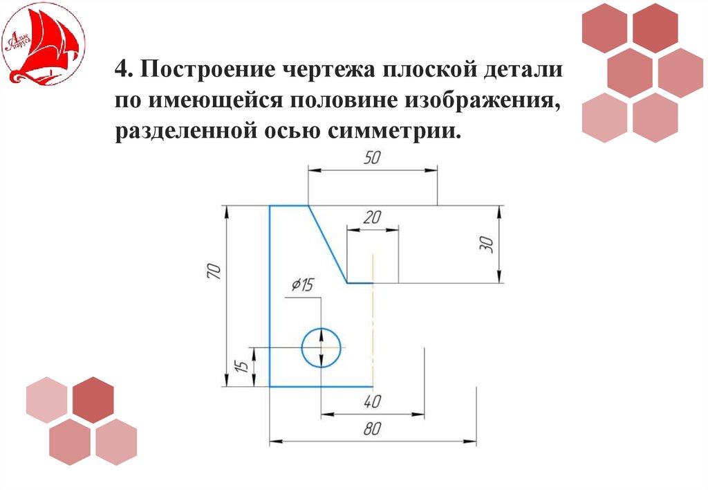 4. Построение чертежа плоской деталипо имеющейся половине изображения,