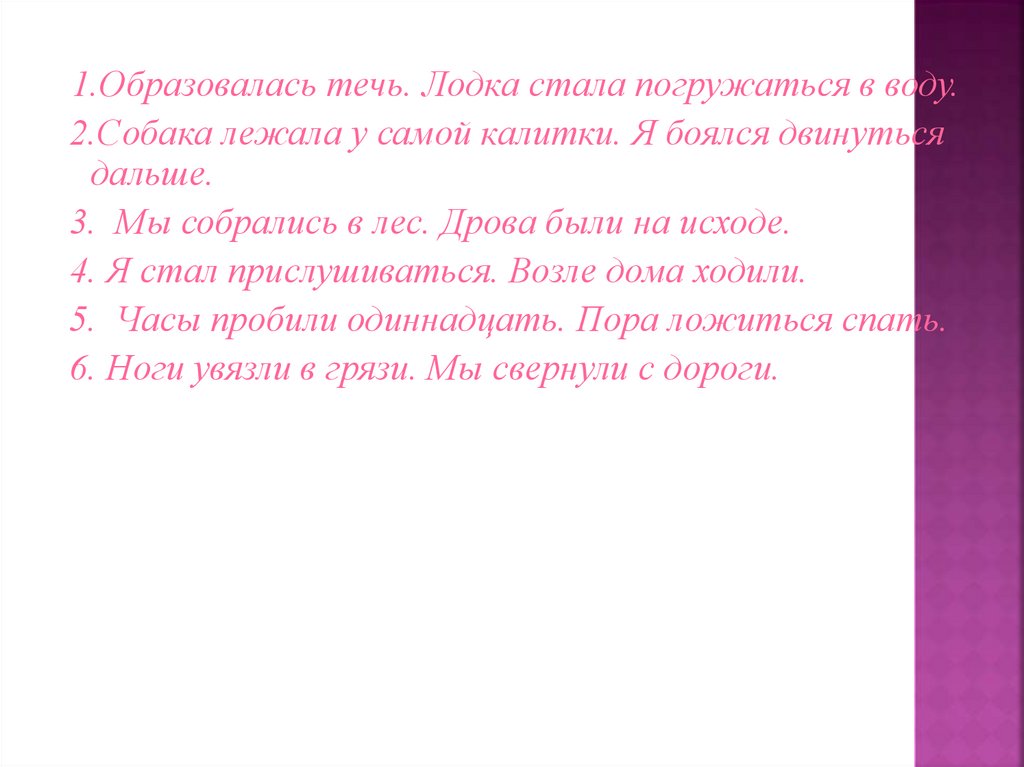 1.Образовалась течь. Лодка стала погружаться в воду.2.Собака лежала у самой калитки. Я боялся двинуться