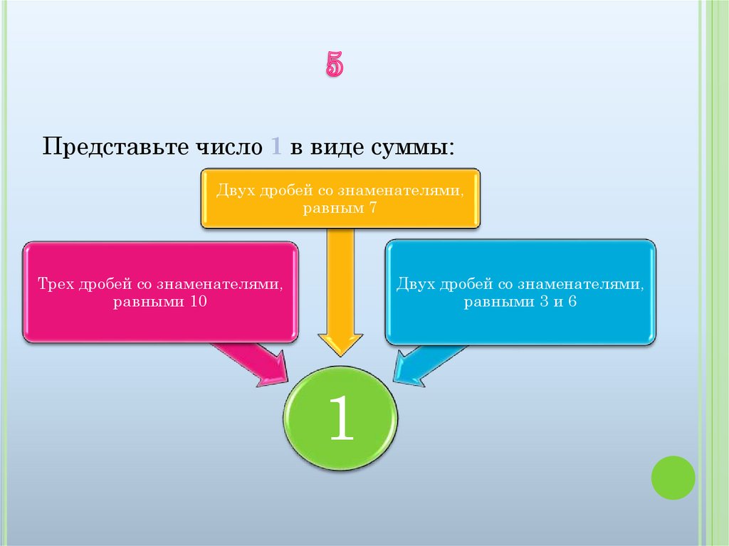 Представьте число 1 в виде суммы:Двух дробей со знаменателями,