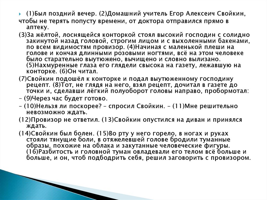 (1)Был поздний вечер. (2)Домашний учитель Егор Алексеич Свойкин,чтобы не терять попусту времени, от доктора отправился прямо в