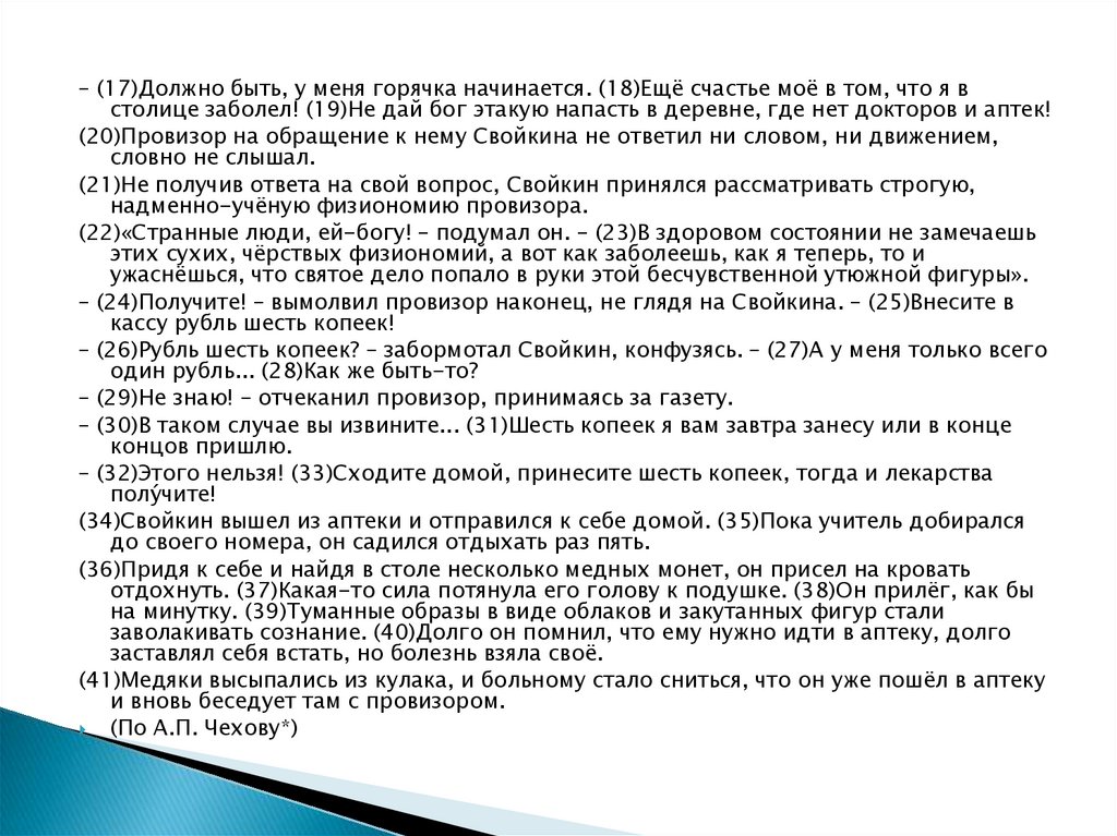 – (17)Должно быть, у меня горячка начинается. (18)Ещё счастье моё в том, что я встолице заболел! (19)Не дай бог этакую напасть в деревне, где нет докторов и аптек!