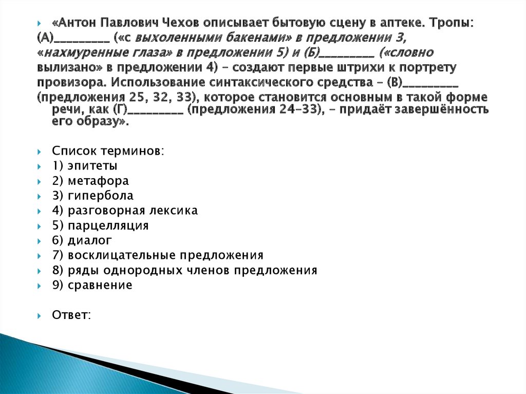 «Антон Павлович Чехов описывает бытовую сцену в аптеке. Тропы:(А)_________ («с выхоленными бакенами» в предложении 3,