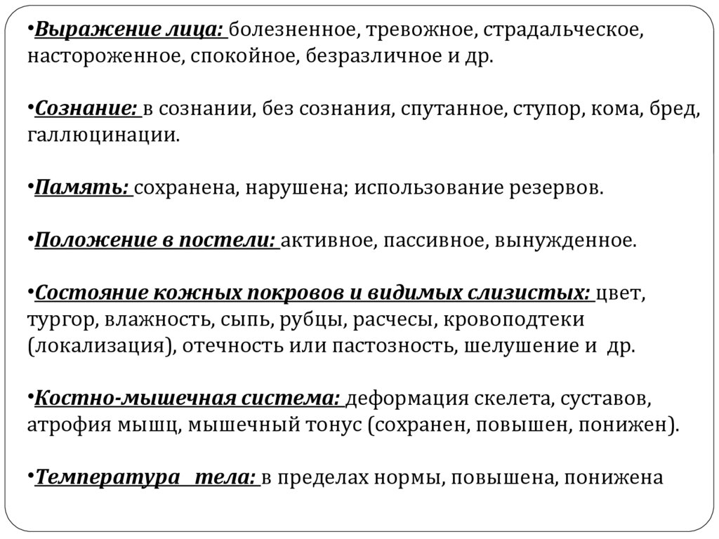 •Выражение лица: болезненное, тревожное, страдальческое,настороженное, спокойное, безразличное и др.