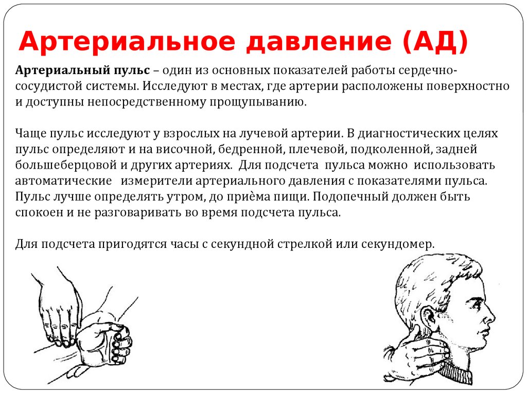 Пульс: количество ударов в минуту, ритм, наполнение, напряжение.