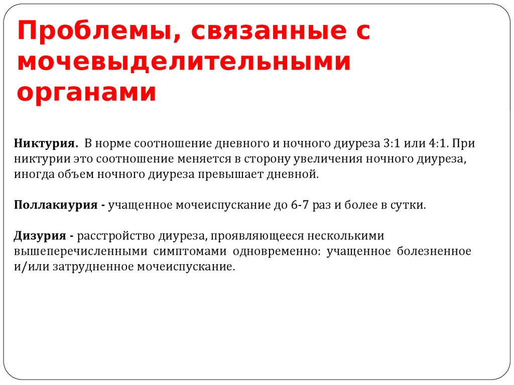 Никтурия. В норме соотношение дневного и ночного диуреза 3:1 или 4:1. При