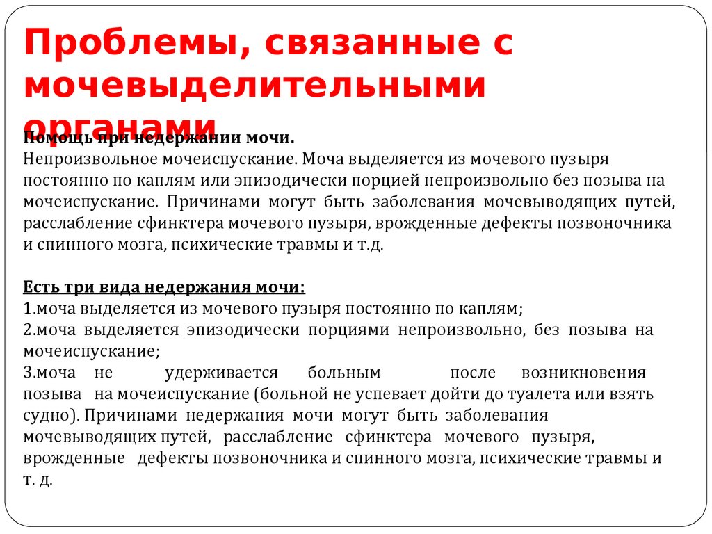Непроизвольное мочеиспускание. Моча выделяется из мочевого пузыря