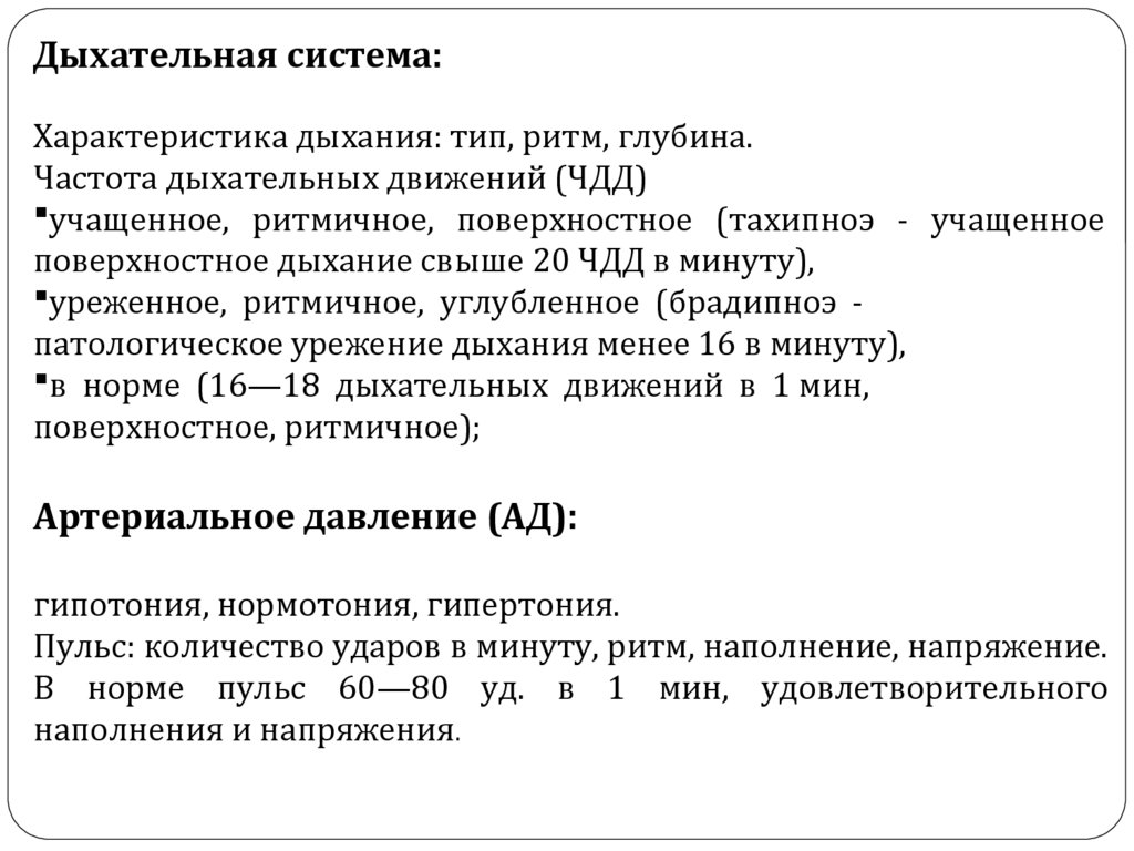 уреженное, ритмичное, углубленное (брадипноэ патологическое урежение дыхания менее 16 в минуту),