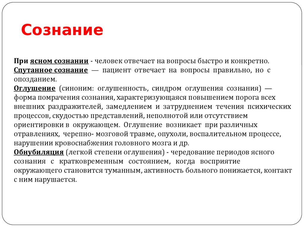 СознаниеПри ясном сознании - человек отвечает на вопросы быстро и конкретно.