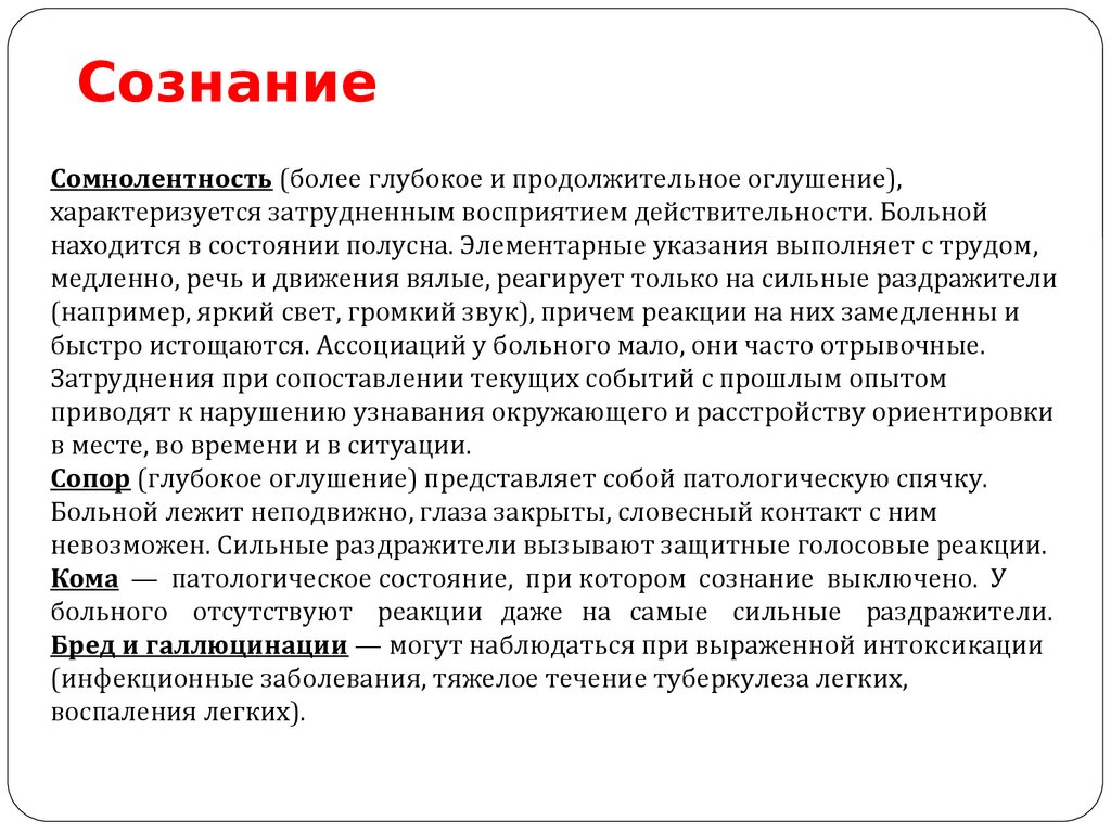 •Сознание: в сознании, без сознания, спутанное, ступор, кома, бред,
