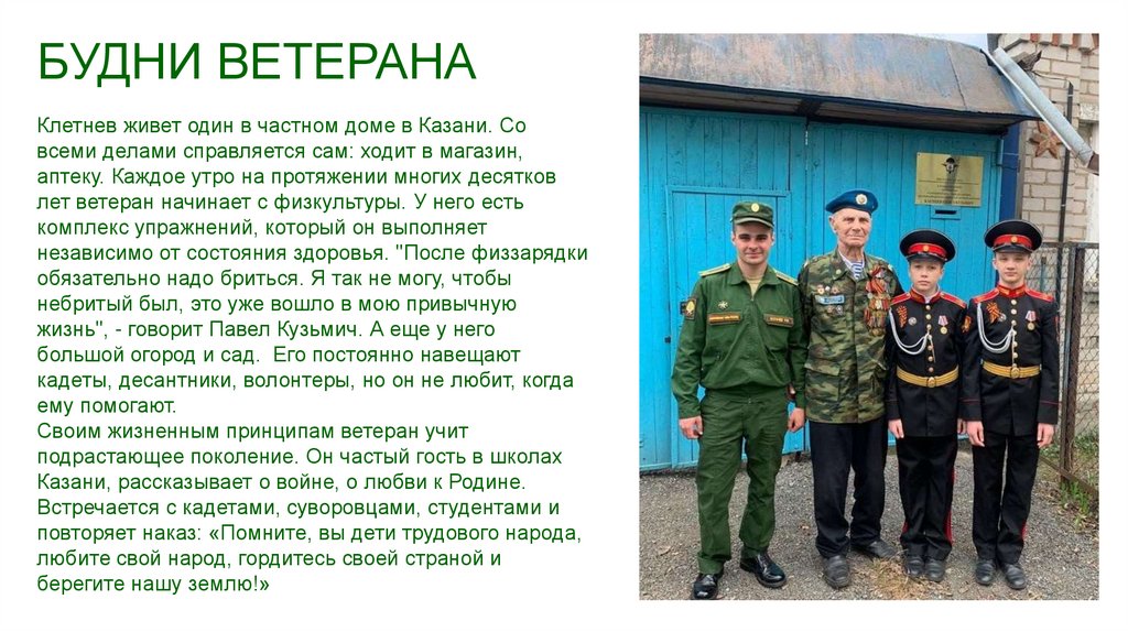 БУДНИ ВЕТЕРАНАКлетнев живет один в частном доме в Казани. Со