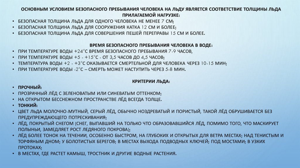 • БЕЗОПАСНАЯ ТОЛЩИНА ЛЬДА ДЛЯ ОДНОГО ЧЕЛОВЕКА НЕ МЕНЕЕ 7 СМ;