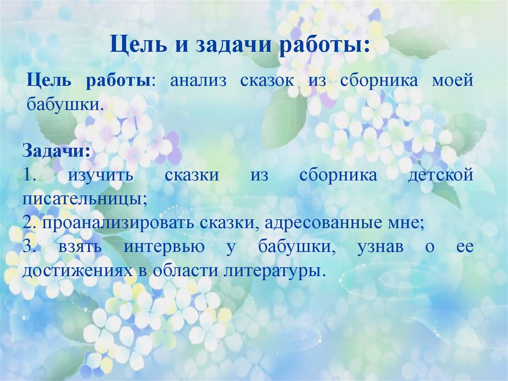 Цель и задачи работы:Цель работы: анализ сказок из сборника моей