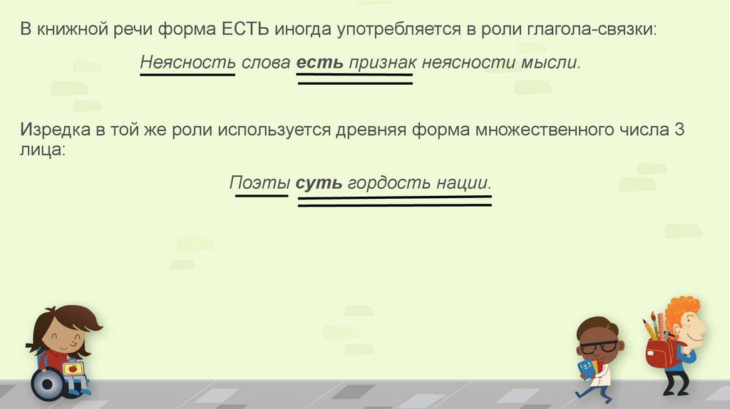 В книжной речи форма ЕСТЬ иногда употребляется в роли глагола-связки:Неясность слова есть признак неясности мысли.