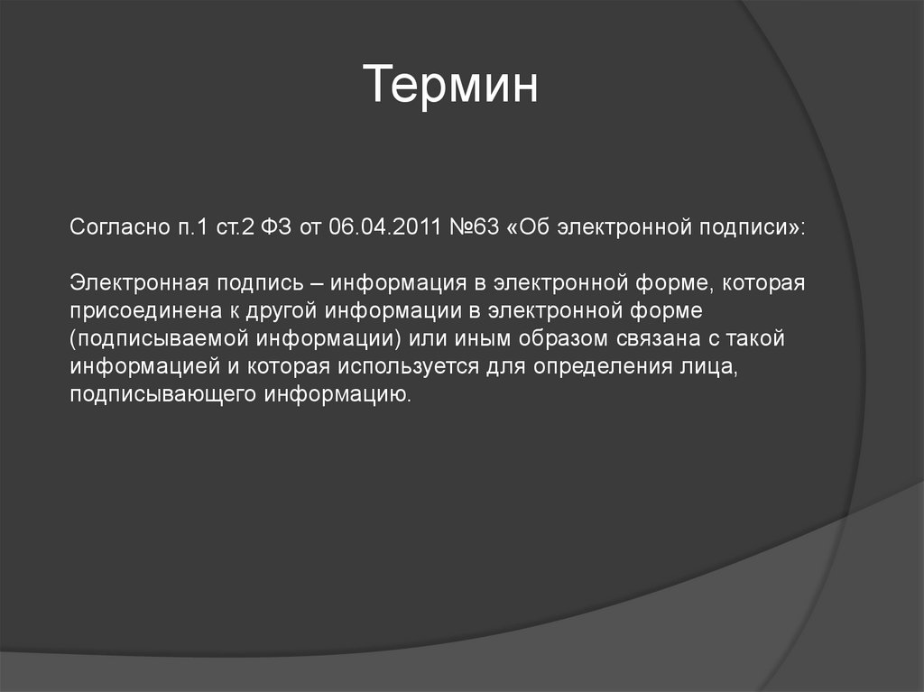 ТерминСогласно п.1 ст.2 ФЗ от 06.04.2011 №63 «Об электронной подписи»: