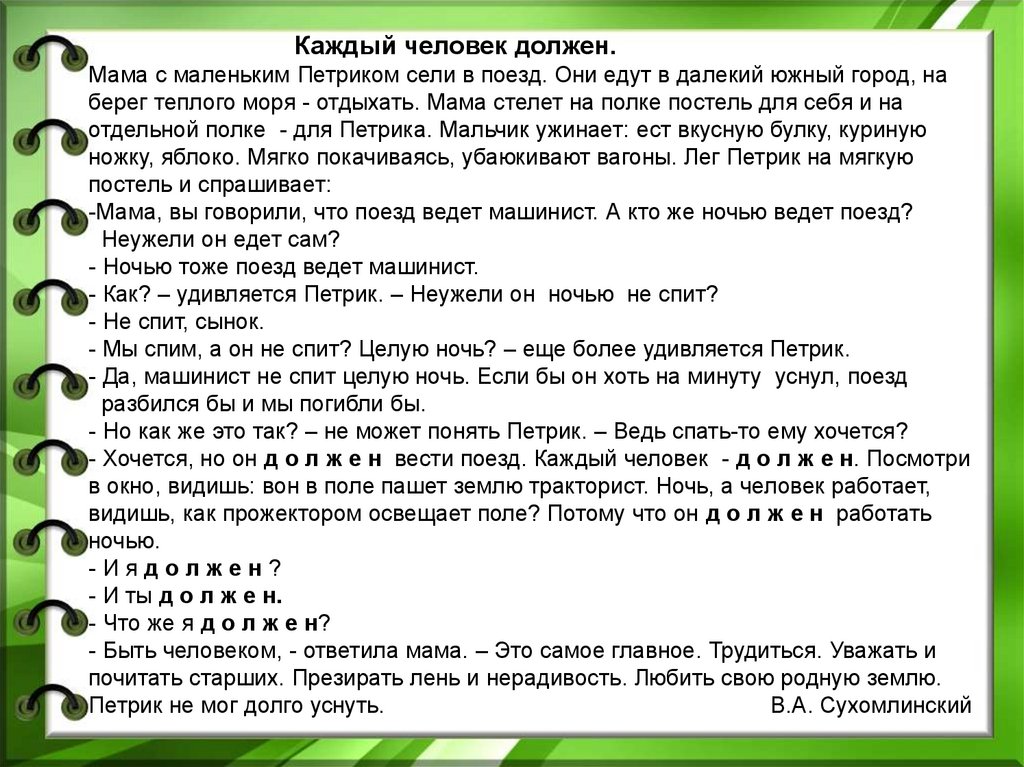 - Хочется, но он д о л ж е н вести поезд. Каждый человек - д о л ж е н. Посмотри