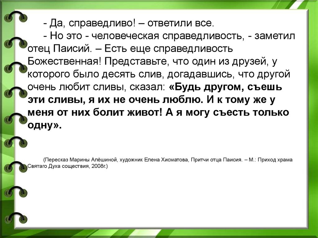 (Пересказ Марины Алёшиной, художник Елена Хисматова, Притчи отца Паисия. – М.: Приход храма