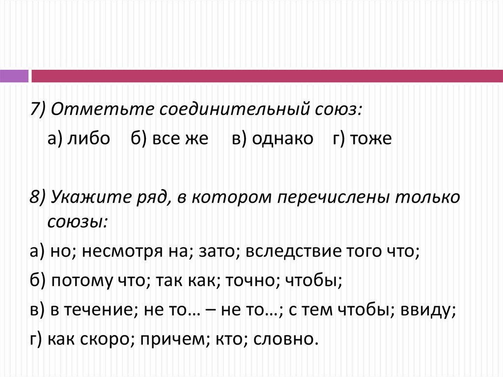 7) Отметьте соединительный союз:а) либо б) все же в) однако г) тоже
