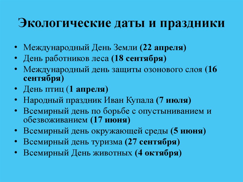 Экологические даты и праздники• Международный День Земли (22 апреля)