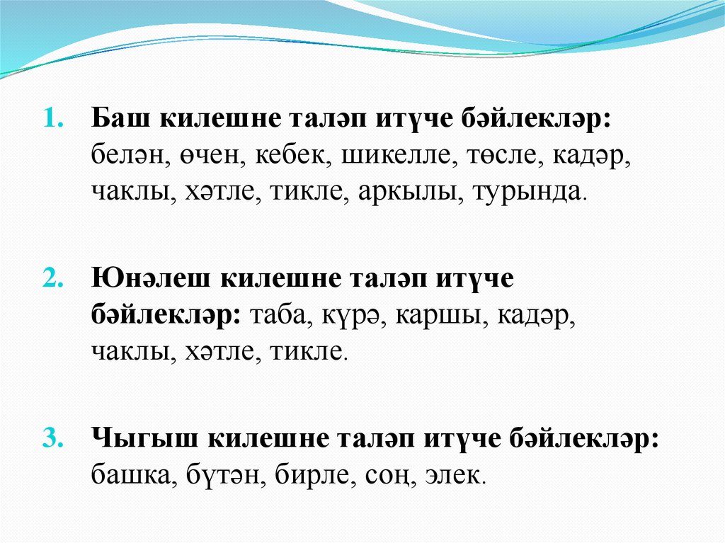 1. Баш килешне таләп итүче бәйлекләр:белән, өчен, кебек, шикелле, төсле, кадәр,