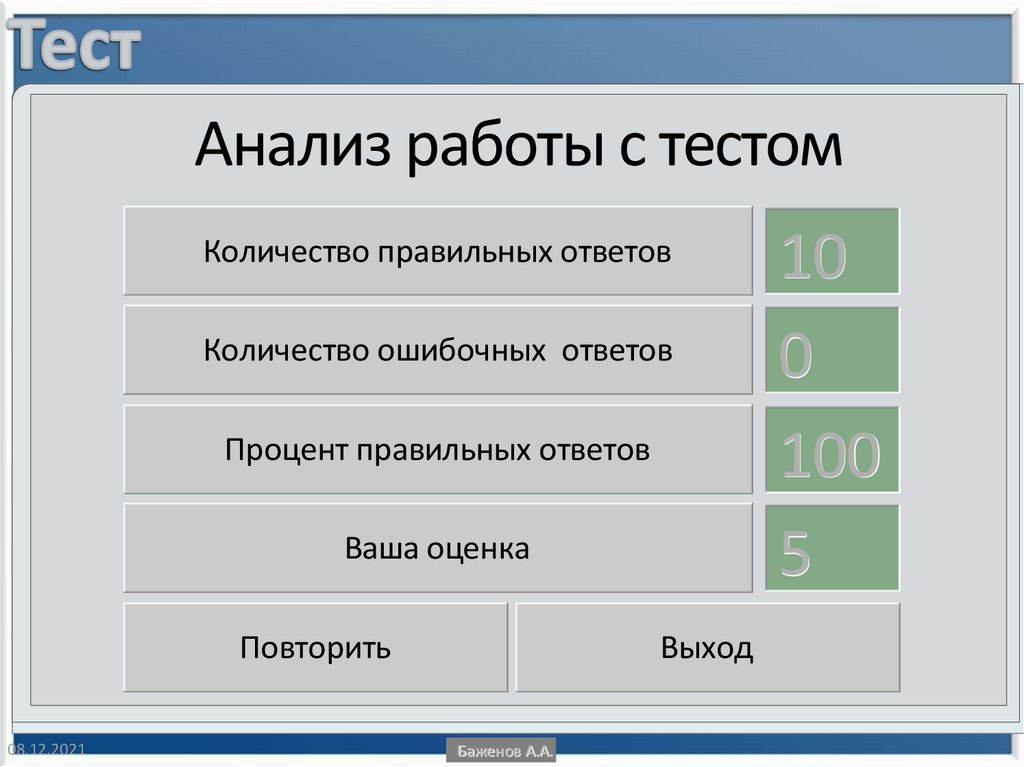 Анализ работы с тестомКоличество правильных ответов