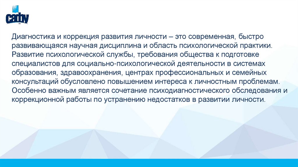 Диагностика и коррекция развития личности – это современная, быстроразвивающаяся научная дисциплина и область психологической практики.